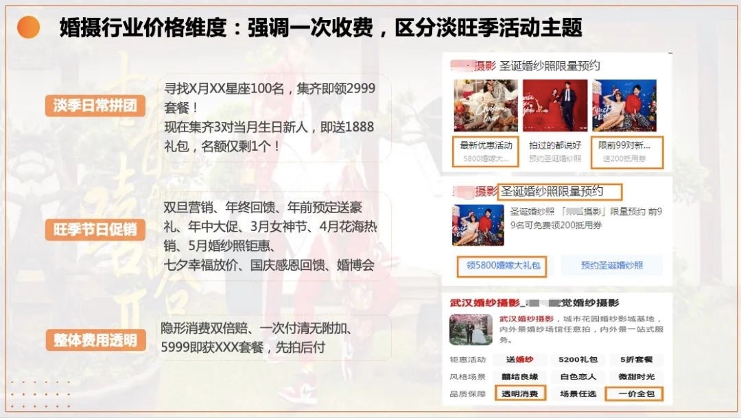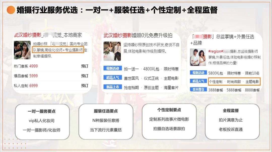婚摄行业在投放创意上可根据不同季节、场景划分为不同的风格维度,做到创意上淡旺季活动主题区分,把握婚博会的营销黄金期,关注以五一、十一为代表的拍摄旺季,淡季日常拼团,旺季节日促销。在整体价格透明的基础上,强调一次性消费,踩准婚摄行业价格维度。