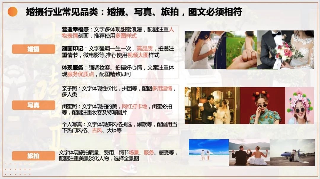 针对不同客群需求,婚摄行业承接的常见业务类型可分为婚摄、写真、旅拍三大类,在图文相符的基础上,不同品类对画面和文案的要求各不相同: