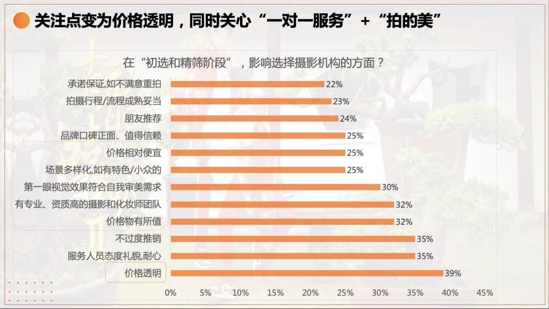 我们也对婚摄客群的关注点做了深度洞察:他们的关注除了集中在价格透明度之外,对服务人员的态度,一对一服务,以及妆造团队、摄影师审美及场景方面都有所要求。