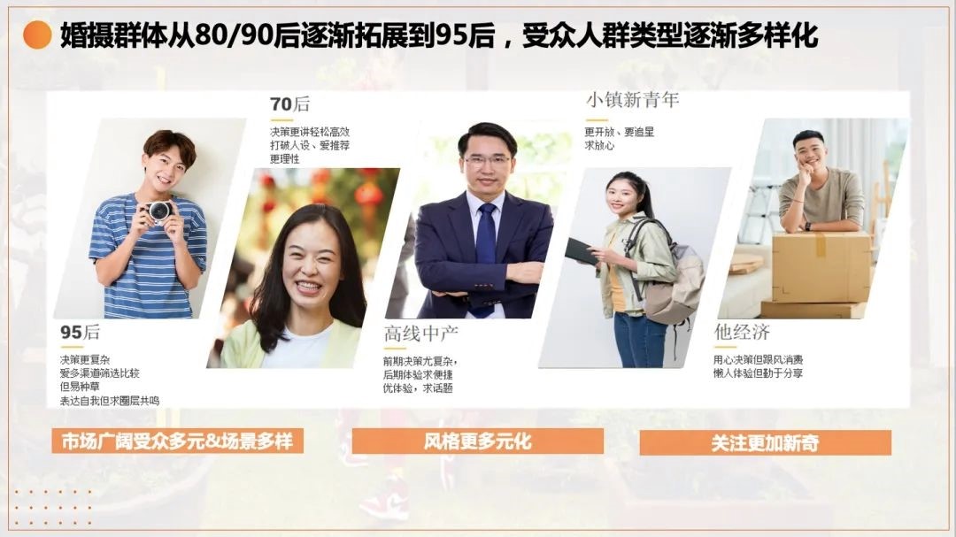 与之对应的,是受众人群的日趋多元化,伴随着95后陆续走进婚姻以及受众群体类型的多元发展,人们对拍摄风格的需求选择也越来越多样,整体上呈现以下三大特征:市场广阔受众细分、场景多样风格多元,人群需求更加新奇。