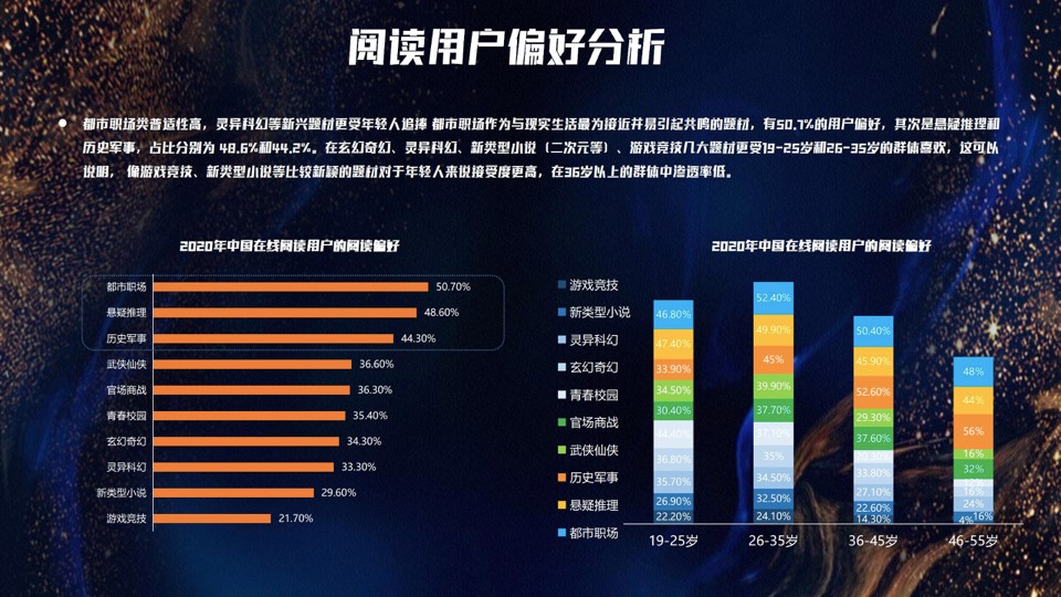 考虑到现有阅读用户的偏好分布:都市职场作为与现实生活最为接近并易引起共鸣的题材,有51%的用户格外偏好;其次获得用户喜欢的是悬疑推理和历史军事类题材小说,用户偏好分别占比49%和44%。此外,七猫小说通过洞察不同年龄用户群体喜好,在海量素材中提炼玄幻、都市、言情、乡村四大类别,通过相应的外层创意和内层场景承接,在把握利益点的基础上,根据书籍类型、频道区分,提取重点内容编辑文案,吸引用户注意力。