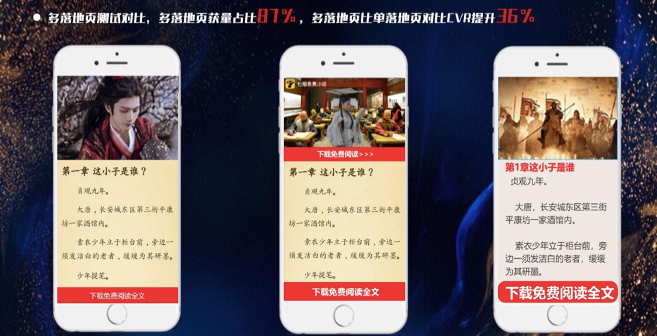 此外七猫小说通过采取不同产品投放策略,提升账户消耗,增加次留率,完成优化需求。通过使用锦帆建站, 基于一个产品制作不同内容角度的落地页, 丰富用户体验,提升投放效果。最终多落地页获量与单落地页相比CVR提升36%。